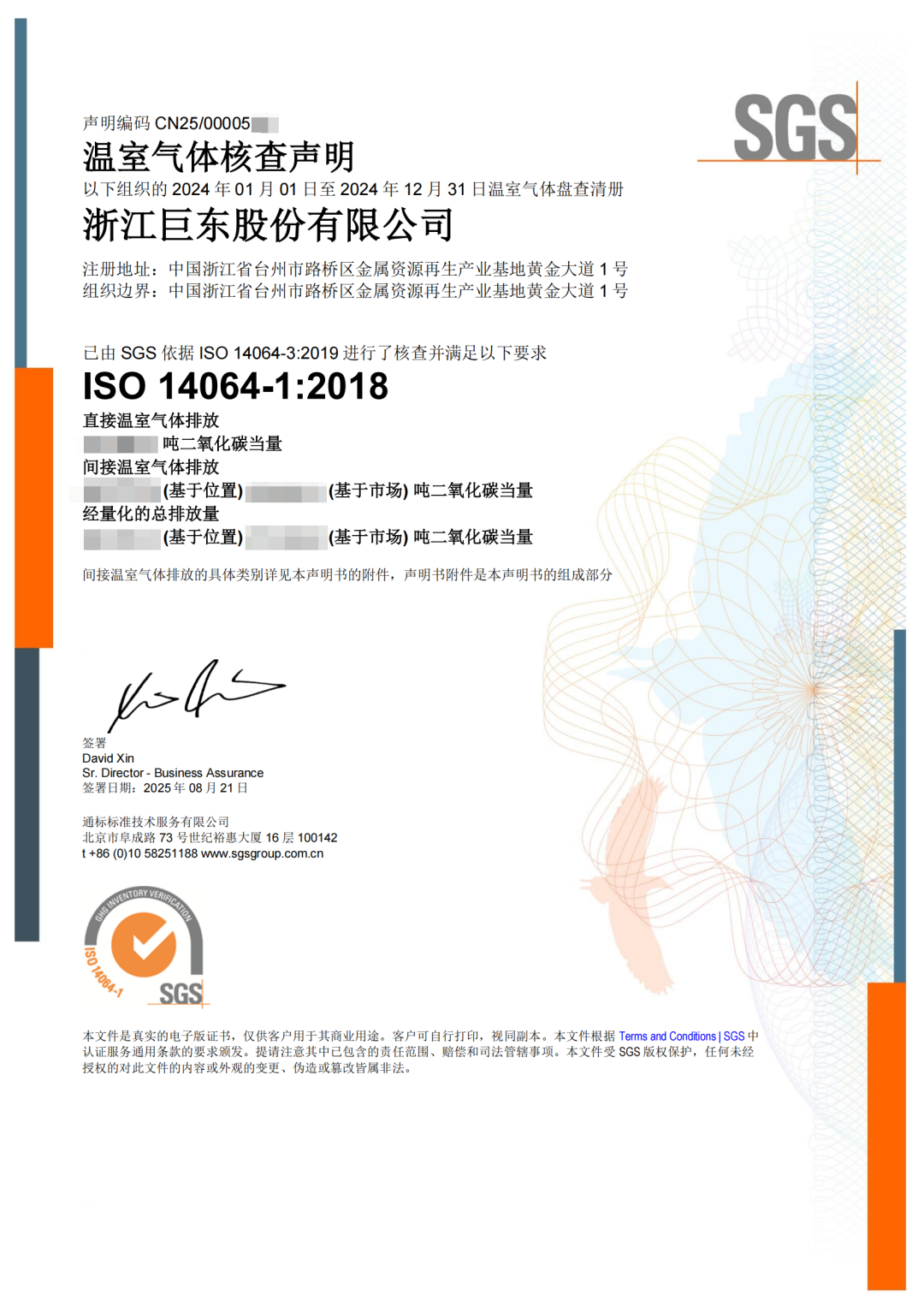2025年8月獲溫室氣體核查聲明